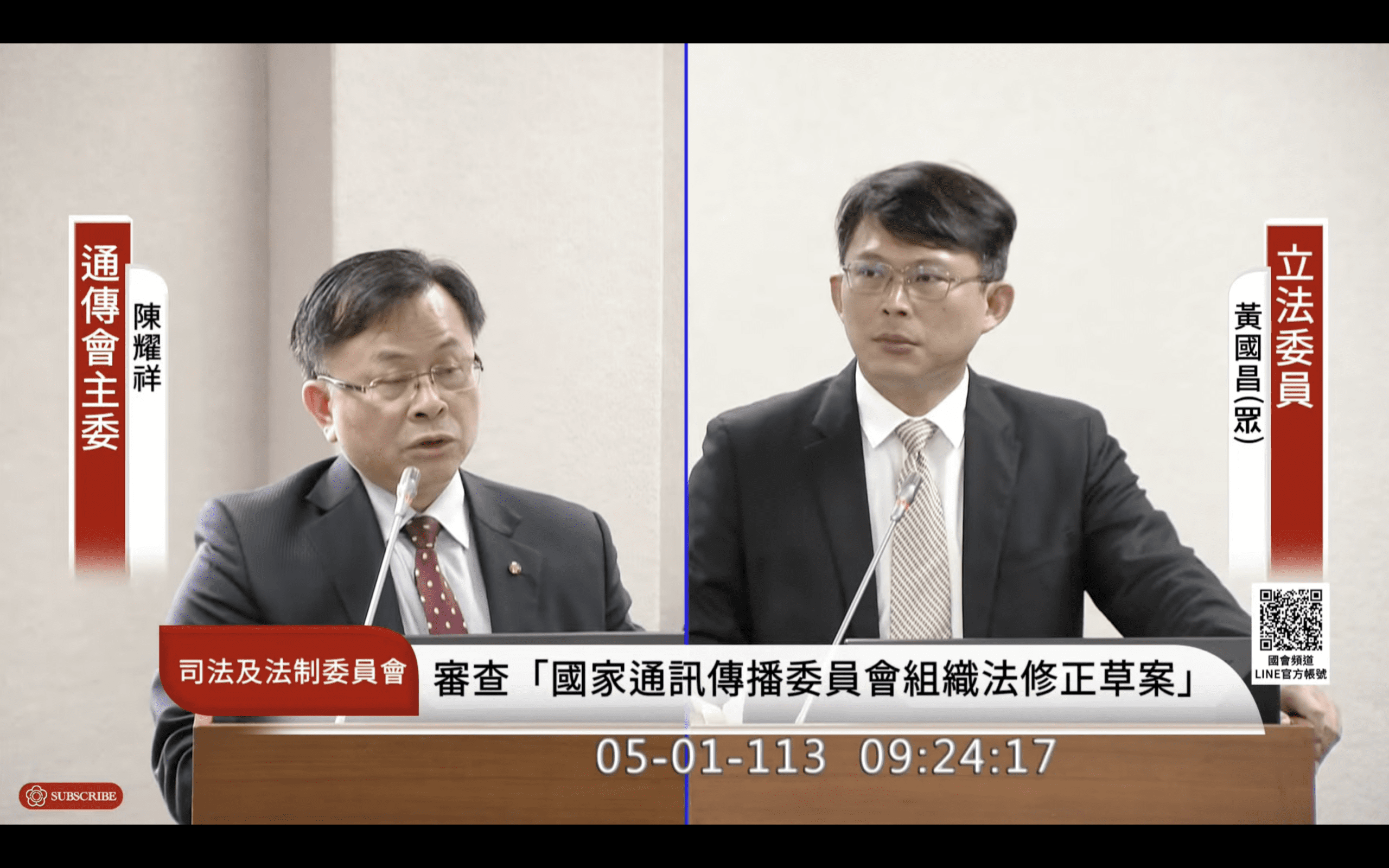 立法院今(1)日司法及法制、交通委員會聯席,審查「國家通訊傳播委員會(NCC)組織法」部分條文修正案,邀請NCC主委陳耀祥列席並備詢。民眾黨立委黃國昌質詢有關鏡電視索資時,直指陳耀祥迫使NCC與立法院對幹,痛批NCC是合議制,但索資卻被陳耀祥一人所阻擋,陳耀祥則稱索資是行政庶務,引起在場國民黨、民眾黨立委不滿,紛紛站起來,引發朝野立委一度拍桌、口角。