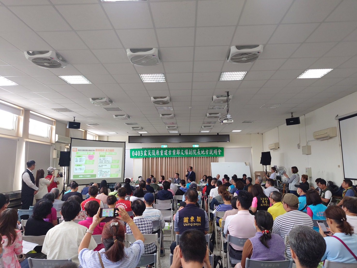 0403花蓮大地震造成重大災情,行政院於5月2日公布重建方案,為使地方黨公職了解方案內容,賴清德主席於5月1日中常會指示組織部於今日配合行政院副院長鄭文燦行程另舉辦地方說明會,面對面溝通並協助解決災後重建需求。