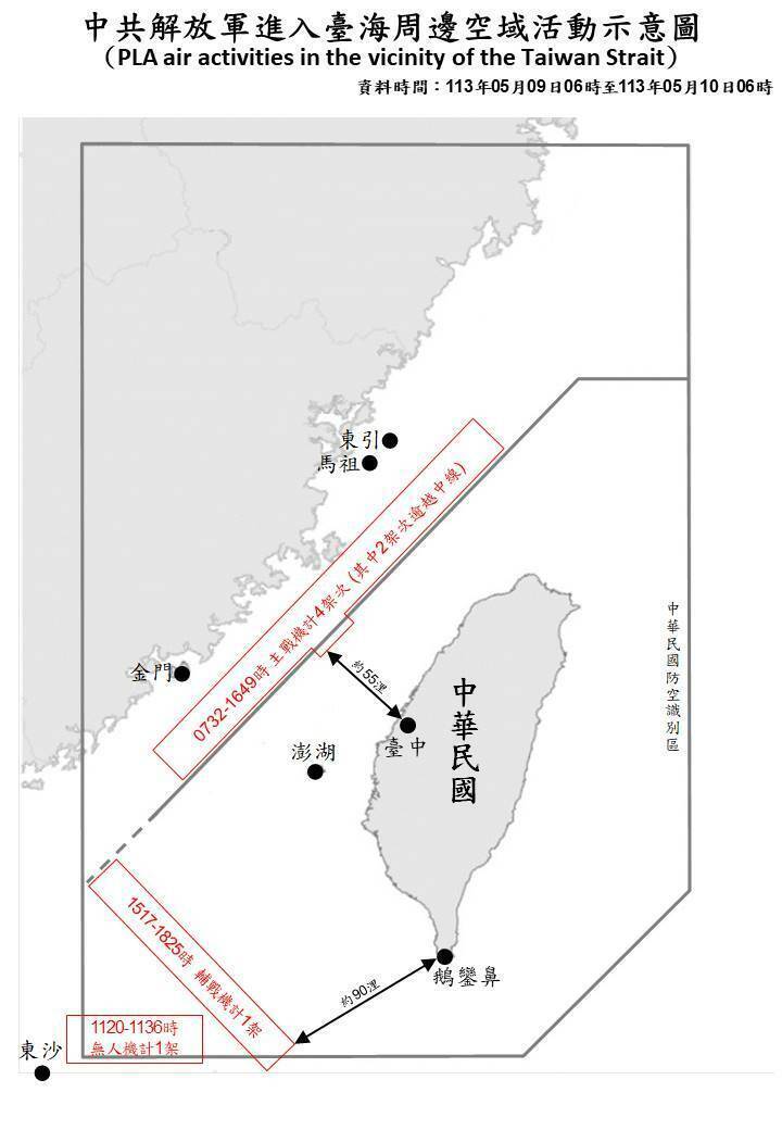 根據國防部公布「中共解放軍進入台海周邊空域活動示意圖」顯示,昨(9)上午7時32分至下午4時49分在台灣海峽空域偵獲主戰機計4架次,其中2架次共機逾越中線,部分共機距離台中僅55浬。