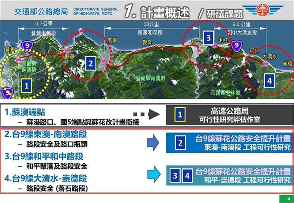 根據資料,在「東澳至南澳」段部分,總長9.3公里,包括4.7公里隧道、3.8公里橋梁及0.8公里的路堤;「和平至和中」段總長為5.5公里,包括4.8公里的橋梁及0.7公里的路堤;「和仁至崇德」段總長為15.1公里,包括10.2公里的隧道、3.1公里的橋梁及1.8公里的路堤,擬以橋梁跨越大清水溪續以2號隧道穿越國家公園。