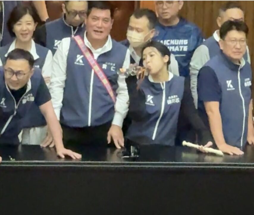 議場大門一打開,各黨立委們就衝議場內,國民黨立委成功佔領主席台,而民進黨則是霸佔質詢台,雙方人馬形成台上、台下互懟的現象,徐巧芯不回嘴,則拿出「喇叭」、「直笛」回應。民進黨立委說什麼,徐就吹喇叭回應。