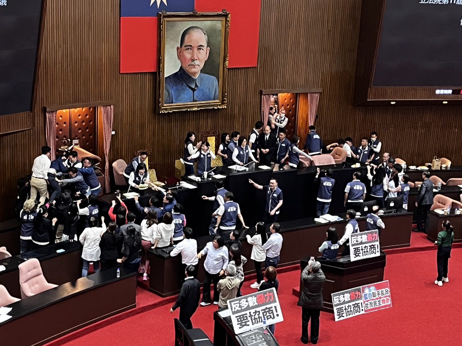 立院院會今日下午休息,因為韓國瑜還在召開黨團朝野協商,卻在接近下午三點之際,韓國瑜突然走進主席台,旁人以為要開始表決大戰的時候,卻僅說「黨團將繼續協商」,便華麗轉身,欲出去前往三樓繼續黨團協商,但帥不三秒,吳思瑤突破藍委黃仁的防線,藍委們空氣頓時寧靜、不知所措,但很快就反應,除了確保韓國瑜要走出去,也把吳思瑤推出去。
