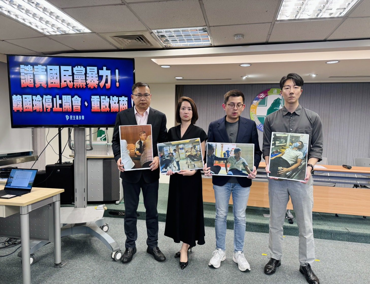 國民黨、民眾黨意圖於今(17)日將「立法院職權行使法」等法案強渡關山,但卻在表決之際,竟用摔、推、拉等暴力方式,將多名民進黨立委扯下台,甚至頭部著地緊急送醫,對此民進黨召開「譴責國民黨暴力!韓國瑜停止開會、重啟協商!」記者會,由政策會執行長王義川、發言人吳崢、戴瑋姍、卓冠廷一同譴責藍白兩黨聯手為了通過違憲法案,竟採用暴力、流氓手段,讓立委直接摔落下桌,呼籲韓國瑜立刻停止開會,找出暴力幕後真兇,並重啟朝野黨團協商,還給立法院一個理性正當的民主殿堂。