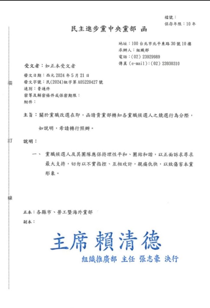 民進黨組織部昨(23)日發函各縣市,要求黨部轉知各黨職候選人的競選行為分際,黨職候選人及其團隊應保持理性和平、團結和諧,以正面訴求尋求最大支持,切勿以不實指控、互相攻訐,親痛仇快,以致傷害民進黨形象。