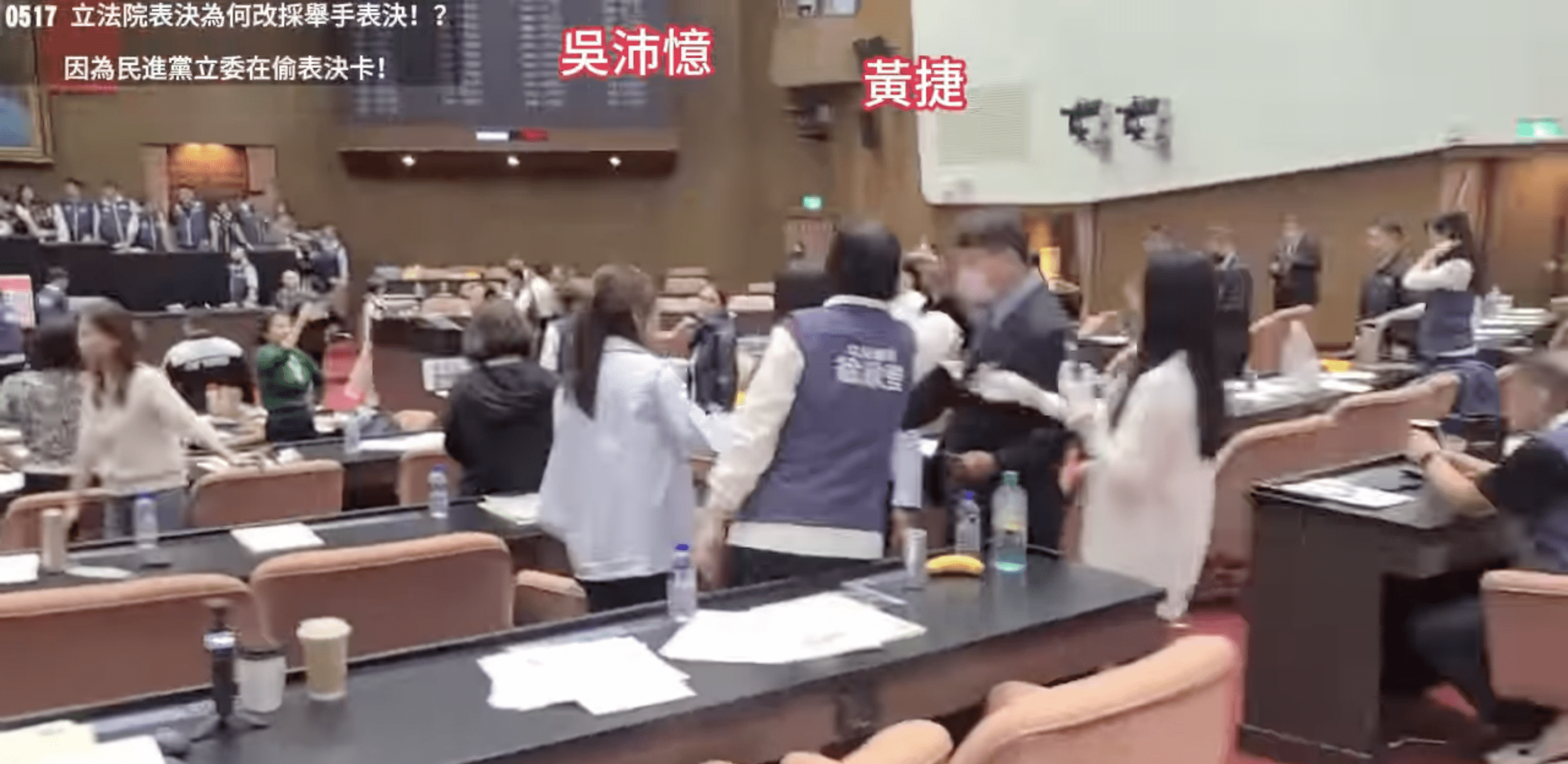 立院上週五審議「國會擴權法案」,藍綠兩黨爆發激烈肢體衝突,更因為「舉手表決」、「點名表決」問題,雙方爭論不休,事情過去快一個禮拜,藍綠在今(23)日隔空爭論誰抽了表決卡?發現到原來是當時佔領主席台的藍委,人不在位子上,卻被插了表決卡,才被綠委黃捷抽走。