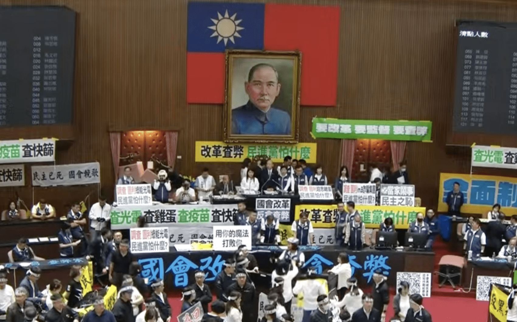 立法院長韓國瑜今(24)日主持院會,在議事人員宣讀上次議事錄時,綠委群集激憤抗議「表決無效、表決做票、反黑箱、退回重審」等口號,並對韓國瑜過去採用「舉手表決」、「反表決」的主席宣告提出異議,最終藍白都透過人數優勢通過主席「舉手表決」宣告。