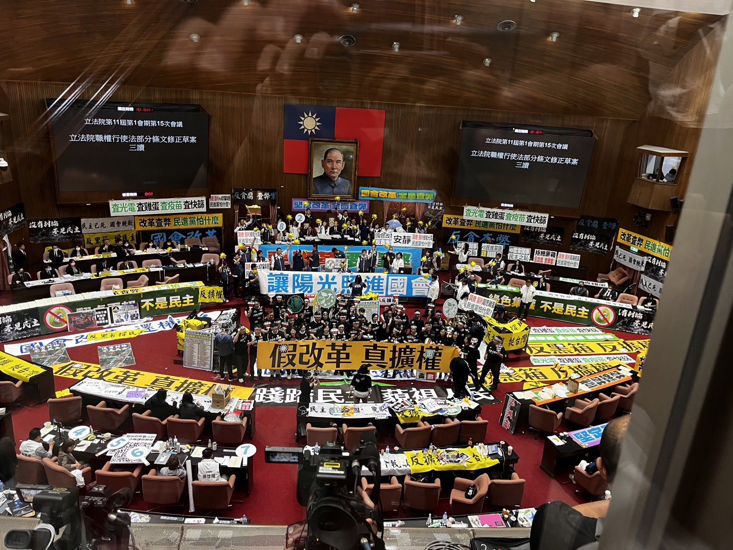 立院今(28)日三讀通過「國會擴權法案」其中「立法院職權行使法」全數修正條文案,含總統國情報告需即問即答、藐視國會罪、人事同意權記名投票、國會調查權、國會聽證權等重大法案,而在逕付三讀過程中,綠委拿著「假改革、真擴權」布條。