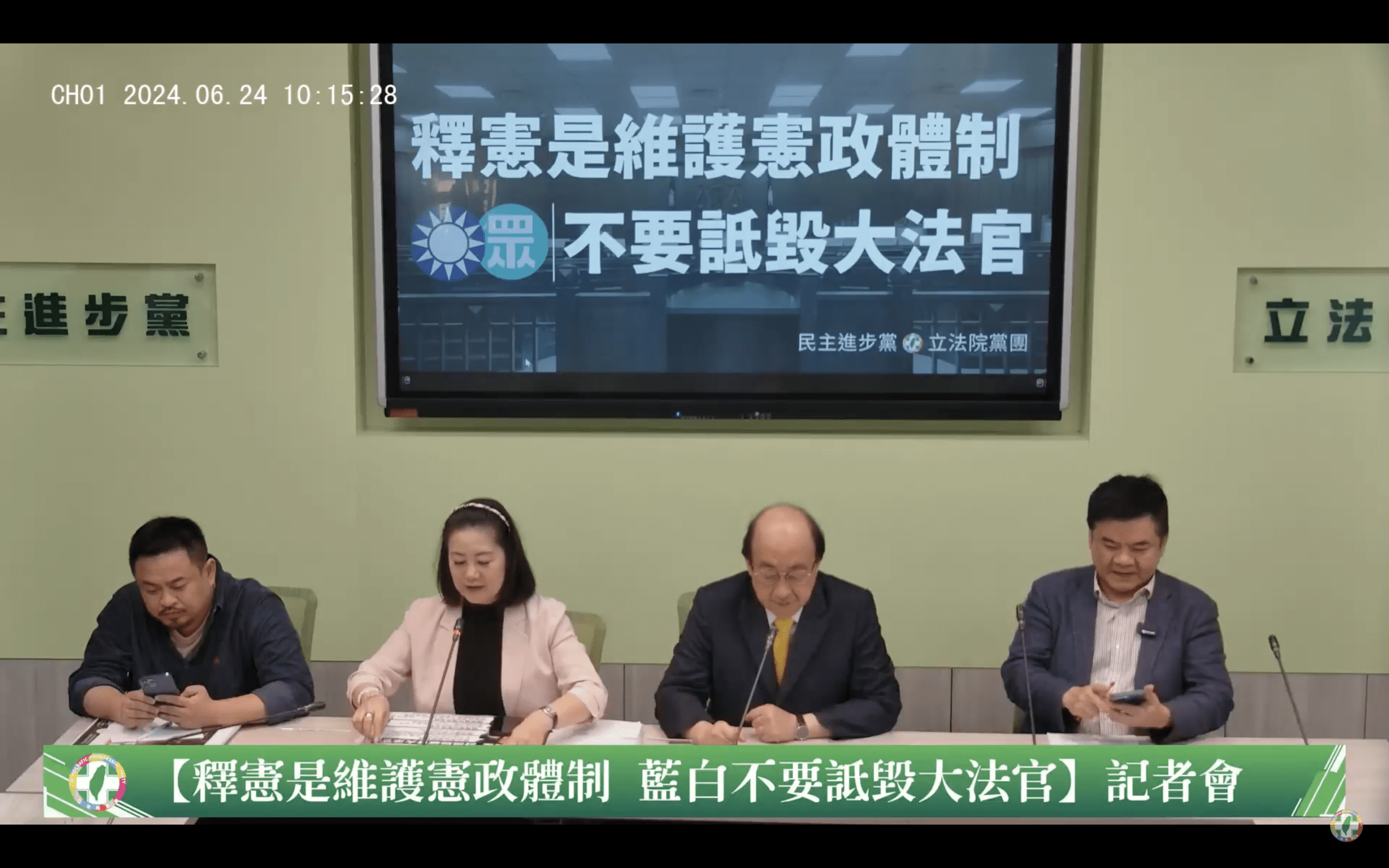 總統賴清德於今(24)日宣布針對「國會擴權法案」將聲請釋憲以及暫時處分。對此,民進黨立院黨團最快將於週三提出釋憲,並表示藍營害怕釋憲,也籲藍白若到憲法法庭不要再咆哮了。