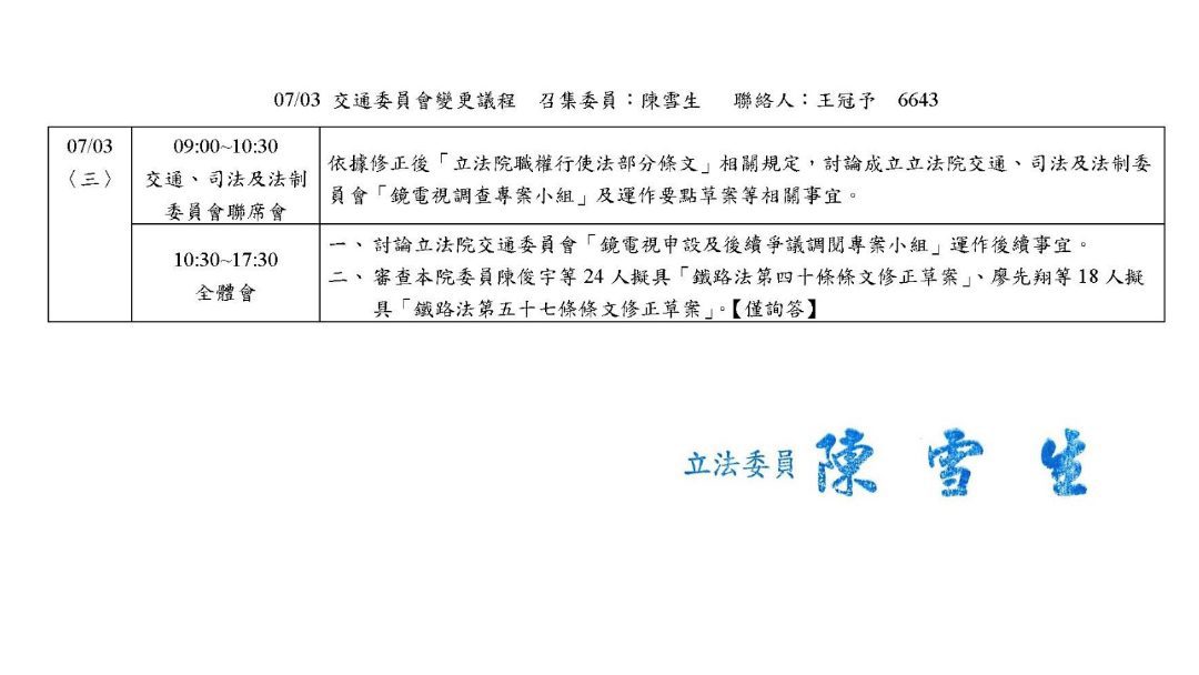 國民黨立院黨團也為此發出甲級動員備戰;國民黨立法院交通召委陳雪生證實該變更議程一案,將開交通、司法及法制聯席委員會議透過「國會調查權」成立首個調查小組。