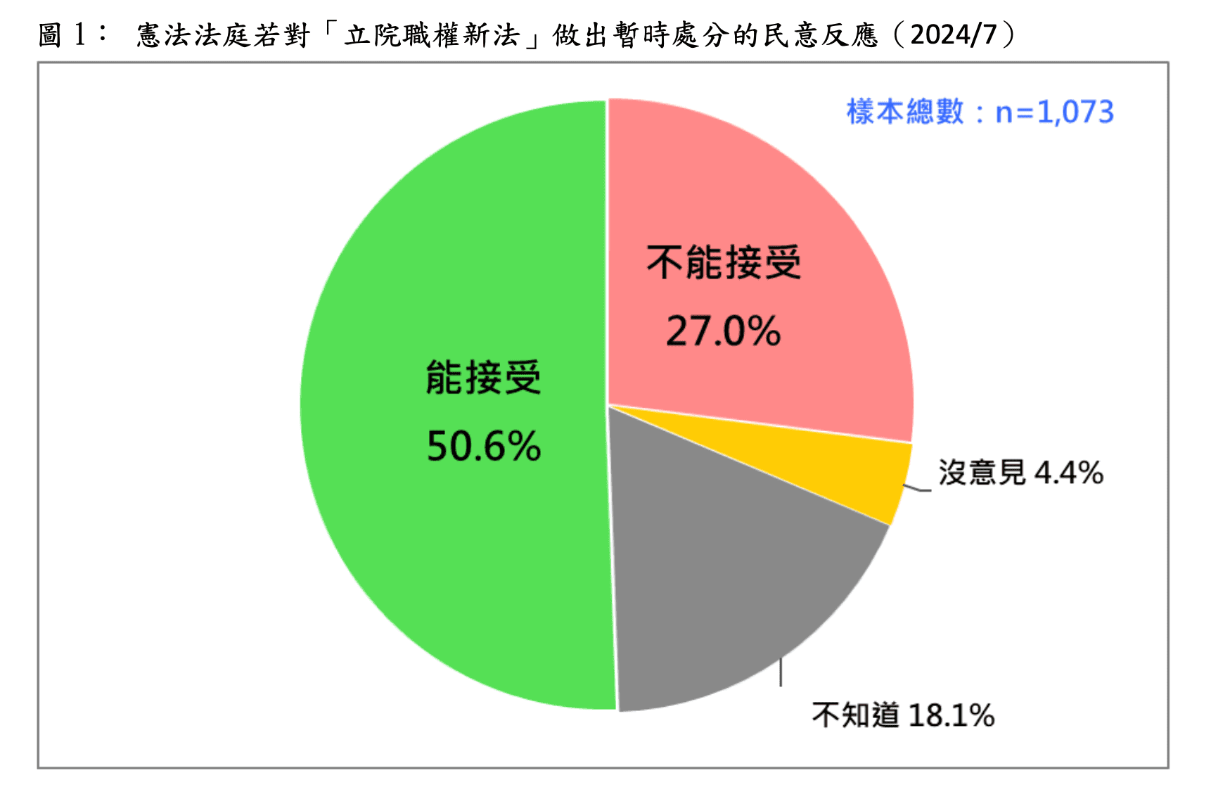 台灣民意基金會也表示,根據民調顯示,20歲以上台灣人中,若憲法法庭最後做出「立院職權新法違憲」的判決,49%大致上能接受,33%不能接受。這項發現傳達了一個重要訊息,那就是,近半數國人已做好接受憲法法庭「國會改革修法違憲」的心理準備。