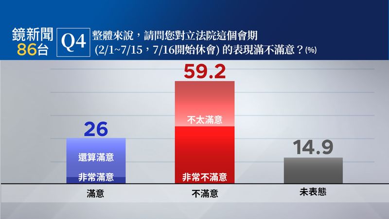 本屆立法院第一會期已於七月十六日休會,針對這個會期的整體表現,僅有26.0%的民眾表示滿意(非常滿意3.9%、還算滿意22.1%),而不滿意度高達59.2%(非常不滿意33.1%、不太滿意26.1%),未表態者占14.9%。