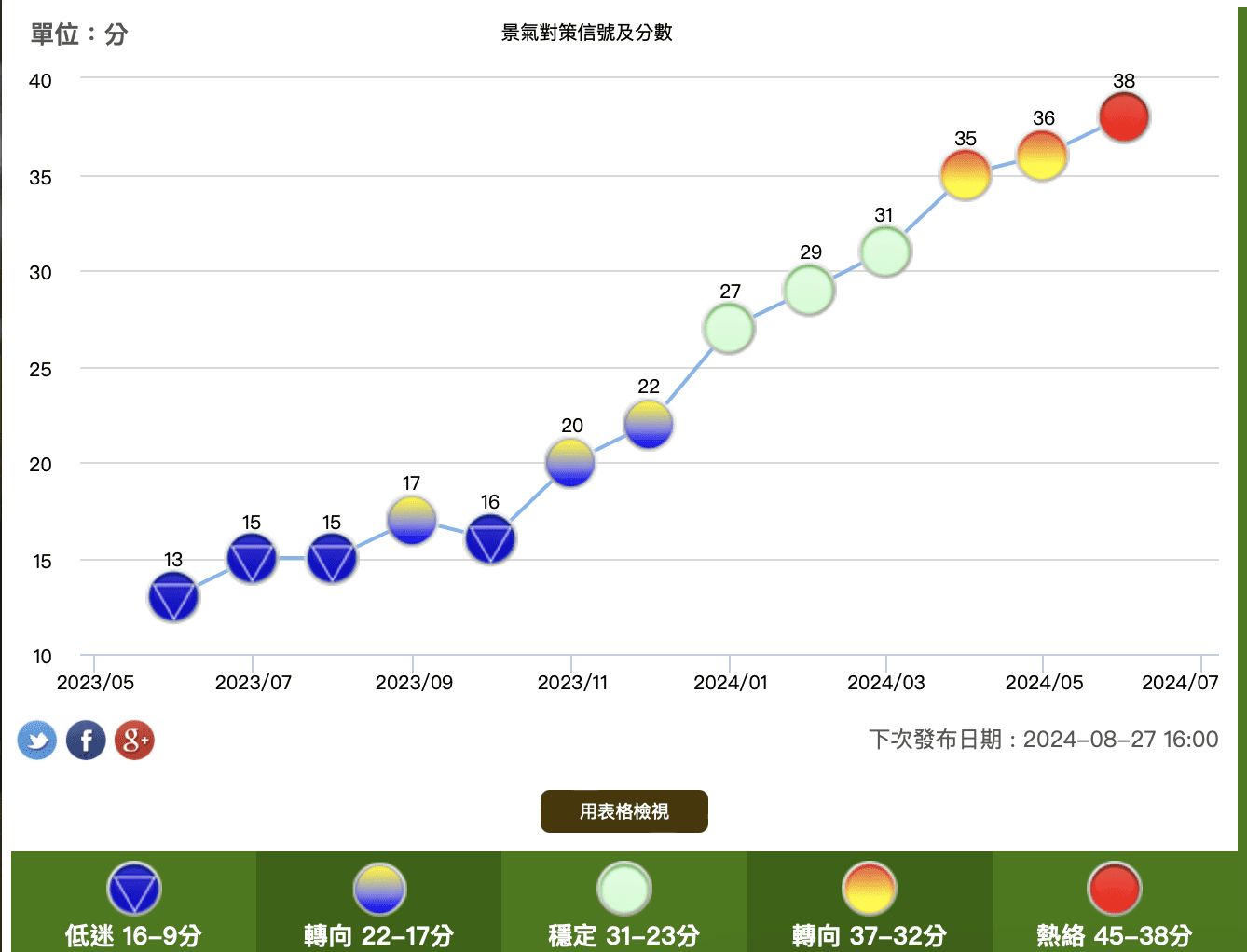 根據國發會的數據,6月景氣對策信號綜合判斷分數達38分,較上月上修值增加2分,景氣燈號由黃紅燈轉為紅燈。受惠於半導體供應鏈及伺服器需求熱絡,加上傳產外銷回穩,出口轉為紅燈,並帶動工業及服務業加班工時轉為黃紅燈;製造業營業氣候測驗點上月上修為黃紅燈,本月恢復為綠燈。領先及同時指標續呈上升,顯示國內景氣持續增溫。