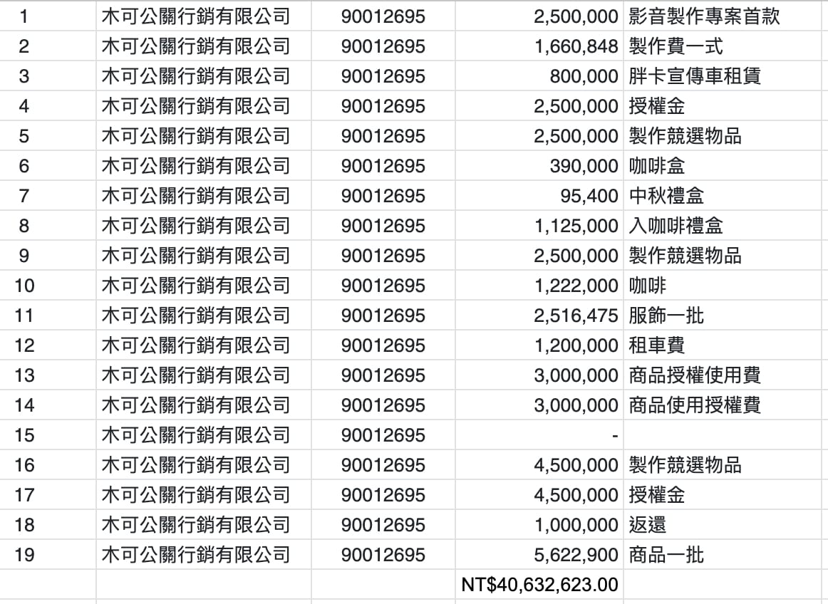 吳靜怡指出,柯文哲在選戰中刻意製造藍白分裂,並營造「很窮」的人設,透過小額募款的方式向年輕人直接要錢,這些募款經費通過多筆「授權」轉入「木可公關」,成為其無本創業的起手式「再來就是『左邊口袋通往右邊口袋的現金流』,右邊口袋就是總統經費帳戶的財源,選舉的財源鎖定從募款而來,那麼就必須要有不斷的競選募款小物上架,這些小物就能從左邊口袋採購而來」,她表示,柯文哲利用小草們的善心,獲得折扣後的貨源,再用分潤的方式簽約,讓貨源達到無本進貨,完成最後收割,達到左邊私人公司「擴大收益」的最終目標,痛批柯文哲毫無避諱地以自己的姓氏開立可能涉及關係人交易的私人公司,「到底是不要臉,還是太自戀?」,隨文附上「木可公關行銷有限公司」的金流項目表。