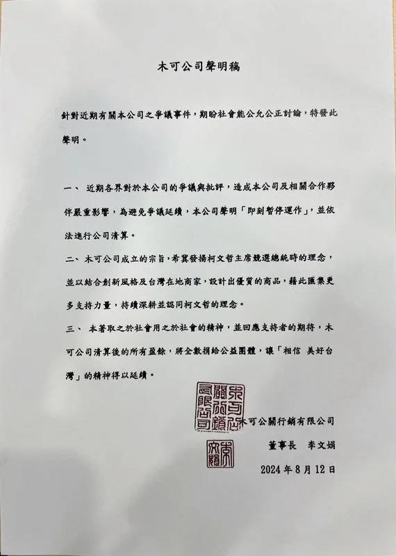 木可公關公司在聲明中指出,公司成立的初衷是希望弘揚柯文哲競選總統時的理念,並結合創新風格與台灣在地商家,設計出優質商品,「藉此匯集更多支持力量,持續深耕並認同柯文哲的理念」,近日民眾黨資金爭議不斷,為了避免持續發酵,公司決定「即刻暫停運作」,並依法進行清算。