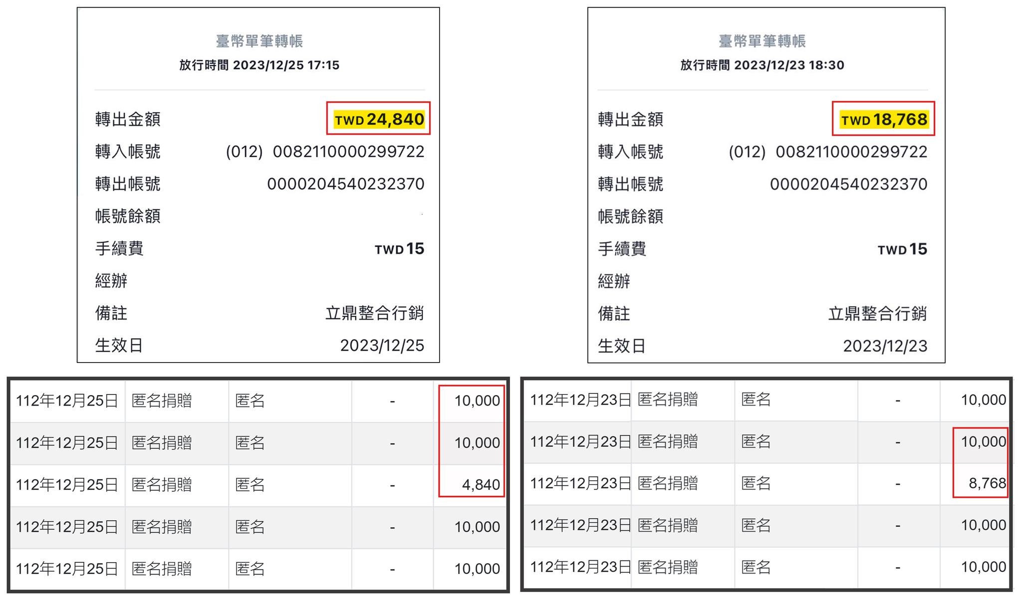 四叉貓13日於臉書上分享了兩張轉帳收據表示,小草們很愛吹噓阿北沒拿財團的錢,但這次他們的把戲被拆穿了,「以下這兩筆帳被抓包拆開了」,他指出,承包製作柯文哲競選小物的「立鼎行銷公司」去年12月23日曾捐贈柯文哲1萬8768元,調閱後的捐贈資料顯示,只有兩筆匿名捐款,分別是10,000元和8,768元;而在去年12月25日,該公司也捐贈了2萬4840元,但在監察院的資料中,查不到這筆捐款,「只有匿名的 10000元 + 10000元 + 4840元」,四叉貓質疑,柯文哲正是透過1萬元以下可以匿名的機制,拆分捐款,將財團的捐款匿名分散入帳,然後對外宣稱「阿北不收財團錢,經費來自小草們的小額捐款。」