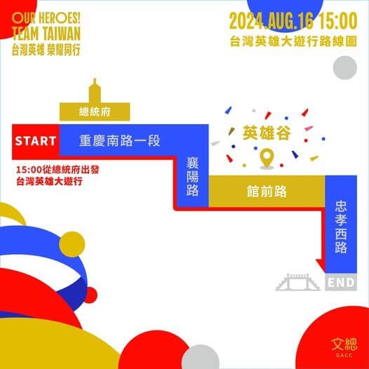 「台灣英雄大遊行」車隊預計於16日下午3時從總統府出發,沿途經過重慶南路一段、襄陽路、館前路(英雄谷),最終在忠孝西路與中山南路交會處結束,邀請民眾前來共襄盛舉、為選手們加油,活動全程將進行直播。中華文化總會今(14)日也在網路上提供5款應援手板圖檔給民眾自由下載,並前往便利商店影印,中華文化總會表示「臺灣英雄大遊行」活動當天從下午2點30分開始,在台灣銀行總行、台灣企銀台北分行、國立台灣博物館前廣場、好樂迪台北館前店、UNIQLO台北車站館前店、新光三越台北站前店,以及忠孝西路與公園路口人行道等7處設置物資站,免費發放國旗和英雄旗兩款手搖旗供民眾索取,「手把手帶大家一起挺台灣!」