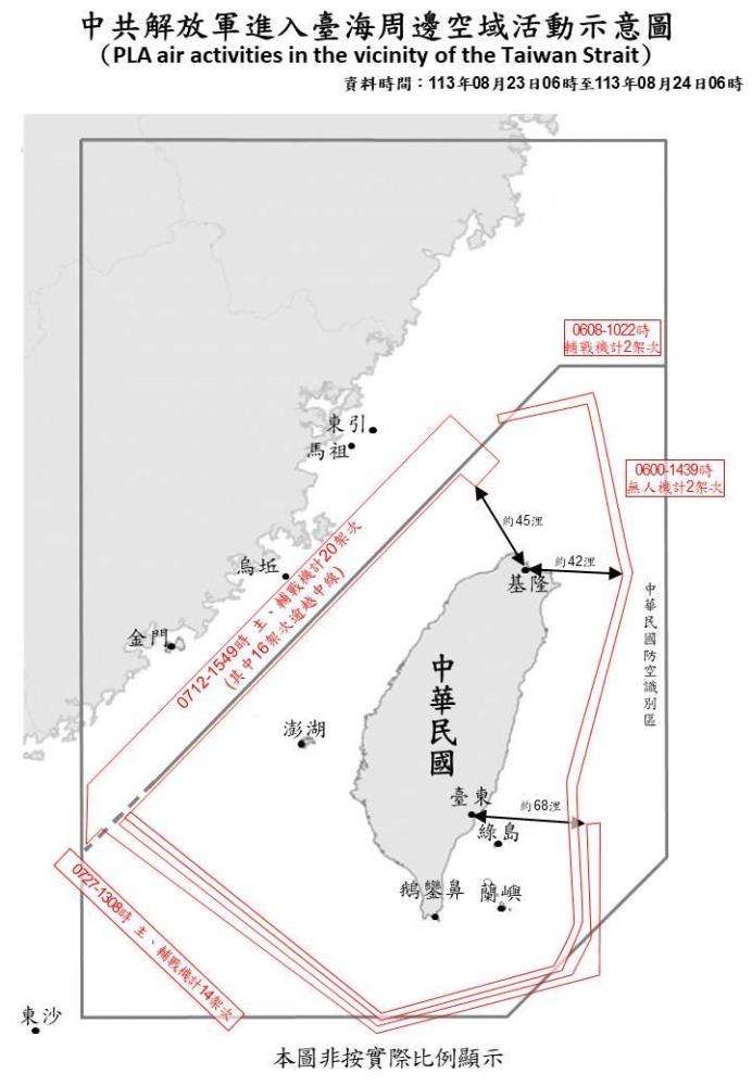 國軍於昨天上午7時12分至下午3時49分,在台灣海峽空域偵獲中共20架次主、輔戰機,其中16架次逾越海峽中線,部分共機距離基隆約45浬,另有一部分共機進入西南空域一路飛行至台灣東部空域,距離台東約68浬。