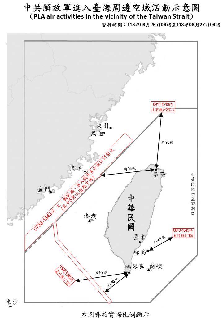 (中央社記者游凱翔台北27日電)國防部今天表示,自昨天上午6時起至今天上午6時止,9架次共機逾越台海中線並侵擾周邊空域,國軍嚴密監控與應處;此外,中共將於8月29日在山西太原衛星發射中心發射運載火箭,將經過台灣ADIZ。