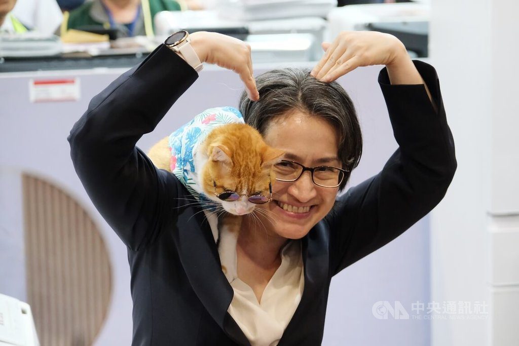 副總統操作吸塵器除貓砂,引起群眾圍觀,當她抱起一旁的寵物網紅「貓界小鮮肉阿蹼仔」時,現場驚呼聲連連;她不但把貓咪放在肩上讓大家拍照,還開玩笑說自家貓咪是「俗辣」,不像「阿蹼仔」完全不怕生,擺好姿勢給大家拍照。
