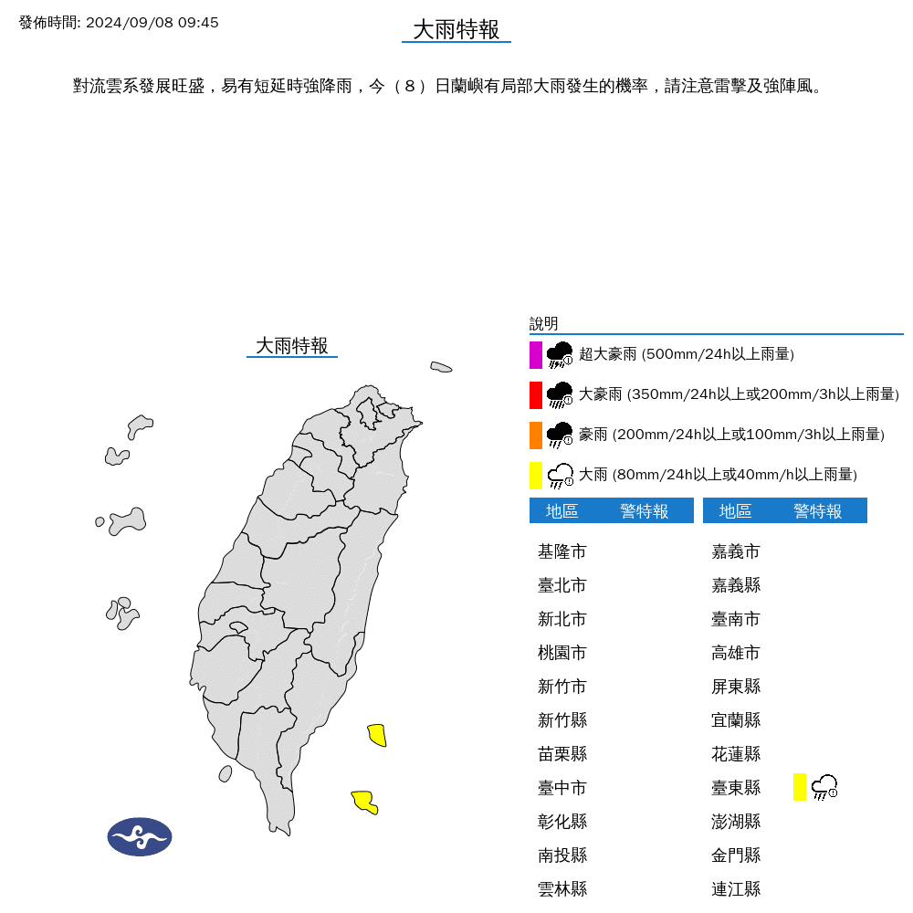 Share Facebook Twitter LinkedIn Pinterest Email (中央社台北8日電)中央氣象署發布豪雨特報,對流雲系發展旺盛,易有短延時強降雨,今天澎湖有局部大雨或豪雨,高雄及屏東地區有局部大雨發生的機率。 氣象署也提醒,請注意雷擊及強陣風,低窪地區請慎防積水。(編輯:施施)1130908