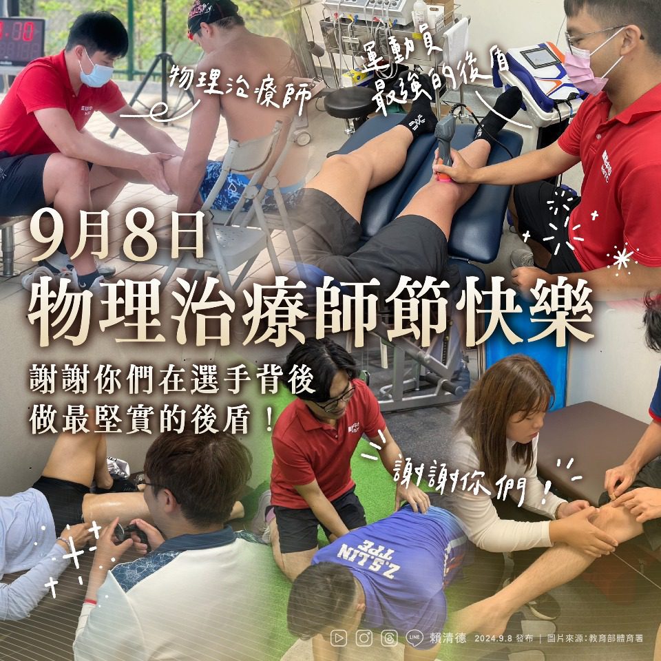 (中央社記者葉素萍台北8日電)總統賴清德今天透過臉書發文表示,在物理治療師節這一天,他要向所有的物理治療師,致上最崇高的敬意,謝謝他們做選手最堅實的後盾,讓選手在賽場上綻放光芒。