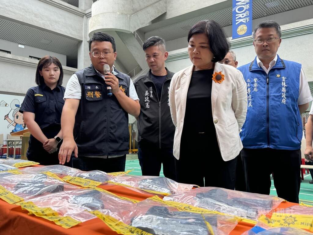 雲林縣警察局今天開破案記者會,現場展示查扣槍枝、疑似不法所得等物,由北港警分局偵查隊長廖祥凱向雲林縣長張麗善說明,張麗善頒發破案獎金給專案小組,慰勉其辛勞。