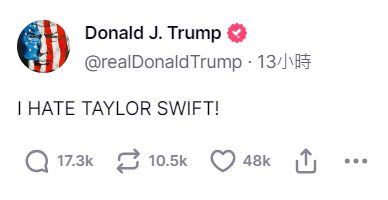 (中央社華盛頓15日綜合外電報導)即使出自經常會故意惹人惱怒的美國前總統川普手筆,他今天沒頭沒腦發出「我恨泰勒絲!」(I HATE TAYLOR SWIFT!)這樣的貼文,委實出人意料。