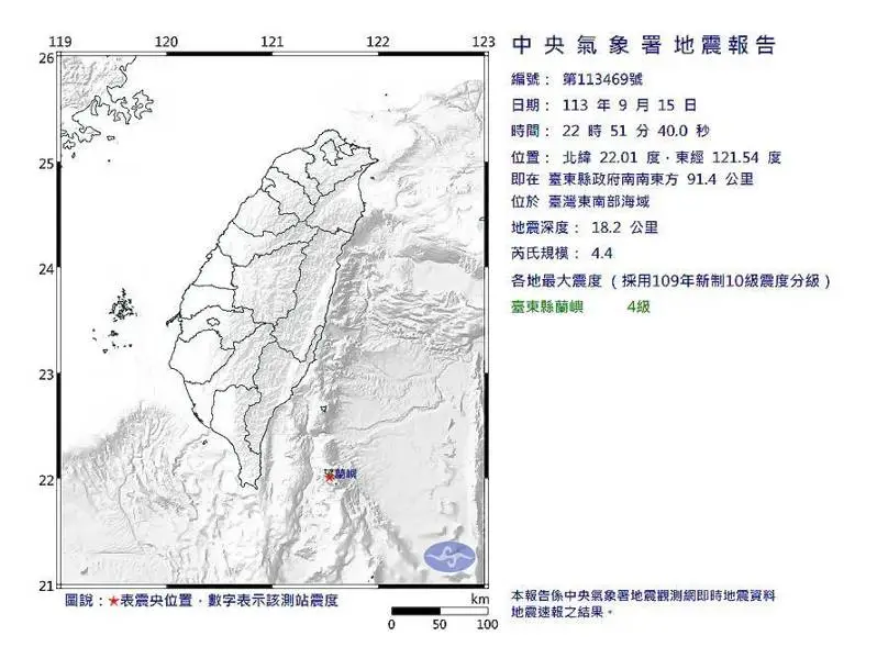 Share Facebook Twitter LinkedIn Pinterest Email (中央社台北15日電)根據中央氣象署最新資訊,15日22時51分發生芮氏規模4.4地震,地震深度18.2公里,震央位於台東縣政府南南東方91.4公里(位於台灣東南部海域),最大震度台東縣4級。(編輯:陳正健)1130915