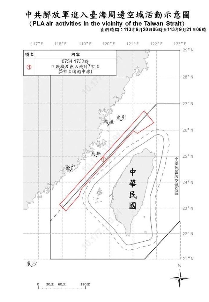Share Facebook Twitter LinkedIn Pinterest Email (中央社記者吳書緯台北21日電)國防部表示,自昨天上午6時至今天上午6時,偵獲共機7架次,其中逾越台灣海峽中線進入北部及中部空域5架次,並偵獲共艦6艘次,總計中共13機艦持續在台海周邊活動,國軍嚴密監控與應處。 國防部今天公布「中共解放軍進入台海周邊空域活動示意圖」,國軍於昨天上午7時54分至下午5時32分,在台灣海峽空域偵獲中共7架次主戰機及無人機,其中5架次共機逾越海峽中線。 國防部指出,國軍運用任務機、艦及岸置飛彈系統嚴密監控與應處。(編輯:楊凱翔)1130921
