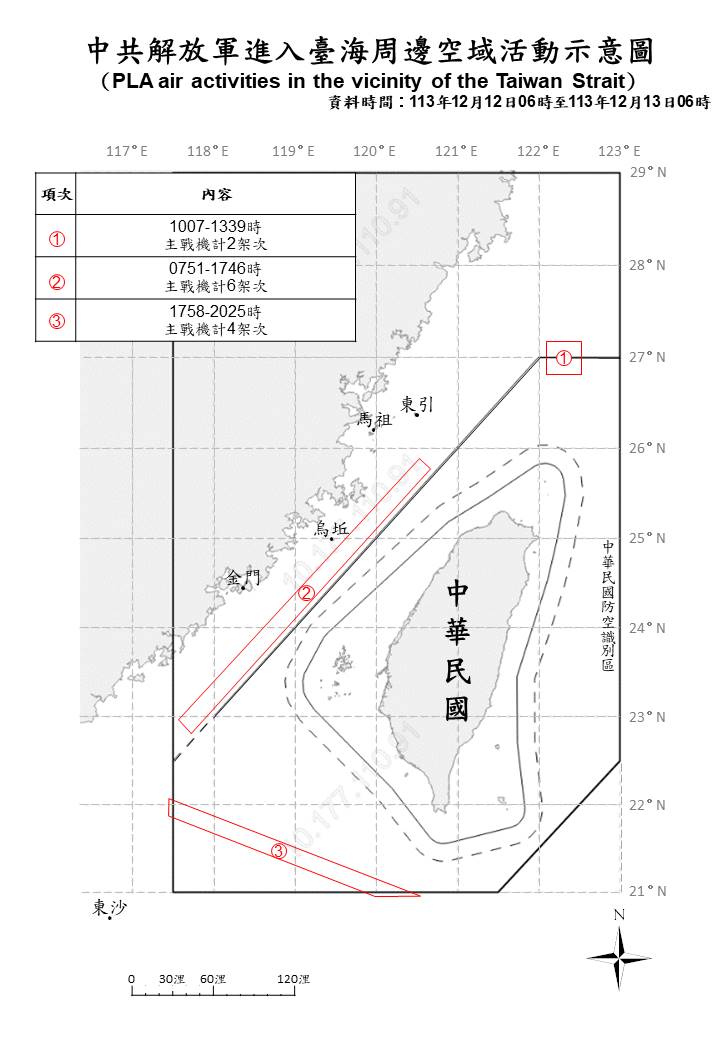 國軍資料顯示,6架次共軍主戰機侵擾中部空域;2架次共軍主戰機進入北部空域;4架次共軍主戰機進入西南空域。國軍運用任務機、艦及岸置飛彈系統嚴密監控與應處。