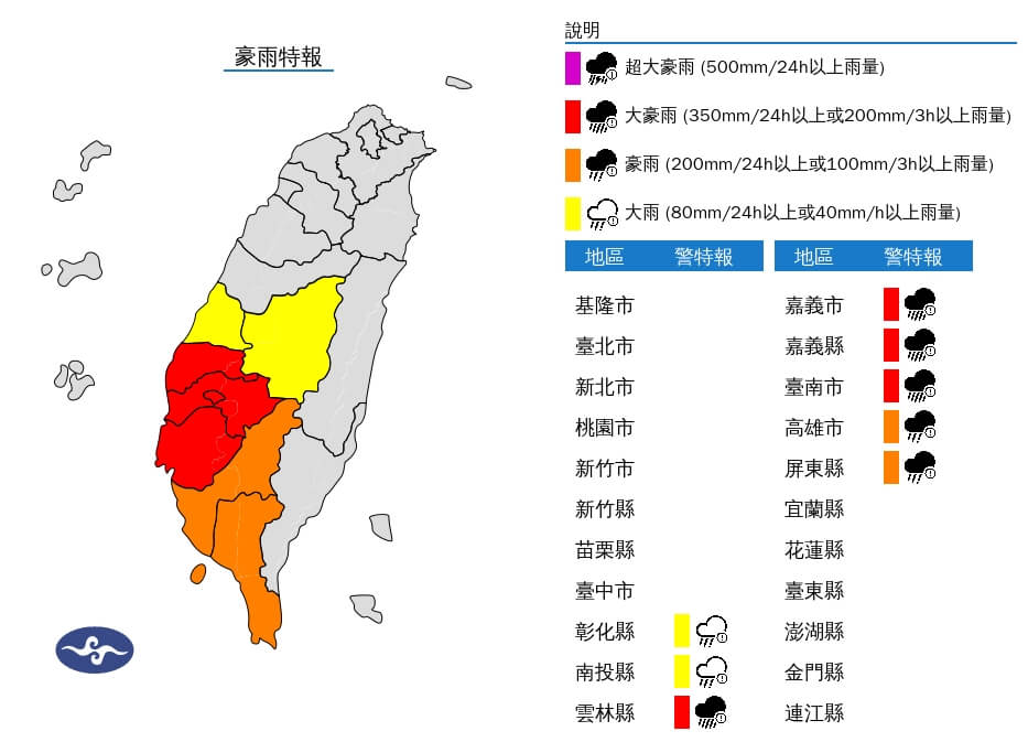 (中央社台北28日電)中央氣象署發布豪雨特報,低壓帶及西南風影響,易有短延時強降雨,苗栗縣及台中市已有豪雨發生;今天雲林縣、嘉義縣、嘉義市、台南市地區,恐有局部豪雨或大豪雨。