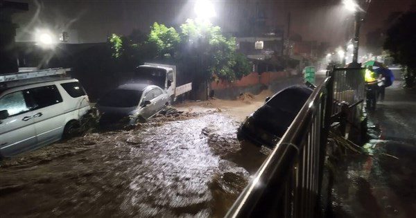 彰化縣警察局彰化分局1名員警指出,警方獲報後趕到現場,發現2輛轎車卡在香山里鳳山宮前方排水溝涵洞,員警先在現場擺放交通錐,提醒民眾勿靠近,也通知車主,請他們等到天氣狀況許可,再請吊車吊離。