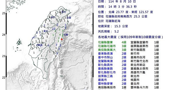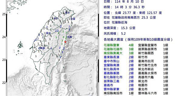 Share Facebook Twitter LinkedIn Pinterest Email 2025/8/10 14:13(8/10 14:23 更新) 10日下午2時花蓮發生規模5.2地震。(圖取自中央氣象署cwa.gov.tw) (中央社台北10日電)根據中央氣象署最新資訊,今天下午2時3分發生芮氏規模5.2地震,地震深度15.3公里,震央位於花蓮縣政府南南西方25.3公里(位於花蓮縣近海),最大震度花蓮縣4級。(編輯:陳仁華)1140810 中央社「一手新聞」 app 本網站之文字、圖片及影音,非經授權,不得轉載、公開播送或公開傳輸及利用。