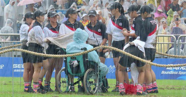 台灣女子拔河隊教練、同時也是全隊精神領袖郭昇,全程也都坐在輪椅上穿著雨衣淋著雨,堅持在場邊督軍下戰術。