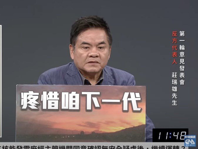 出身屏東的莊瑞雄表示,今天接受台灣綠黨邀請,擔任反方代表捍衛自己故鄉,如同童子賢7月捍衛故鄉花蓮,參與罷免立委傅崐萁的行動;今天核三重啟的法源依據「核子反應器設施管制法」是由國民黨與民眾黨共同提案,但草案和最後三讀通過版本不同,而核三重啟公投案是民眾黨提案,上午提案、下午通過,這都是童子賢過去一年來所看不慣的立院亂象。