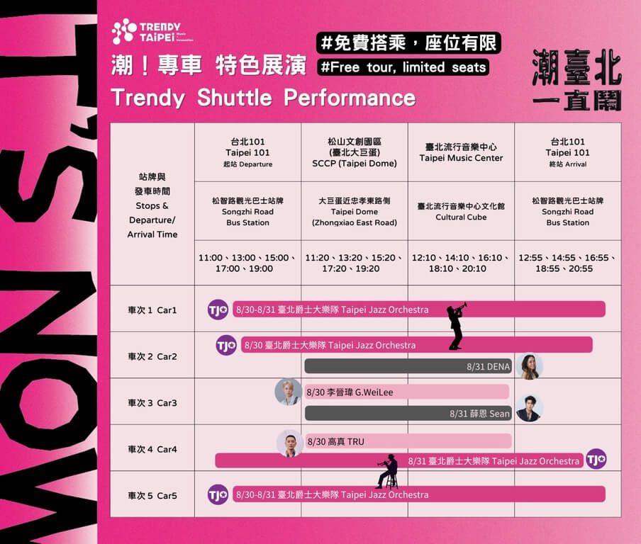 現場演出包含8月30日的不同班次中,創作歌手李晉瑋G.WeiLee與高真TRU,將帶來都會男聲真摯現場演唱;8月31日由新生代女聲DENA與偶像團體C.T.O成員薛恩Sean活力登場;台北爵士大樂隊則將在部分班次駐車即興演奏。(編輯:方沛清)1140818