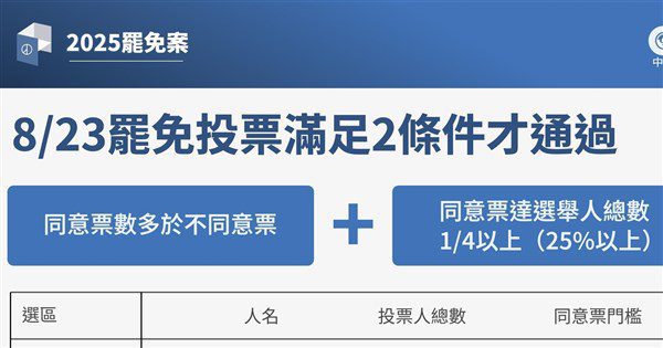 中選會透過新聞稿表示,公職人員選罷法第90條規定,罷免案投票結果,有效同意票數多於不同意票數,且同意票數達原選舉區選舉人總數1/4以上(25%以上),即為通過;相反的,有效罷免票數中,不同意票數多於同意票數、或同意票數不足原選舉區選舉人總數1/4以上者,都是否決。
