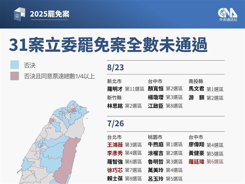 國民黨立委羅明才、林思銘、顏寬恒、楊瓊瓔、江啟臣,馬文君與游顥罷免案今天投票,並在投票結束後隨即開票,連同7月26日24位國民黨立委與停職的新竹市長高虹安罷免案,今年共32罷免案,全遭否決。