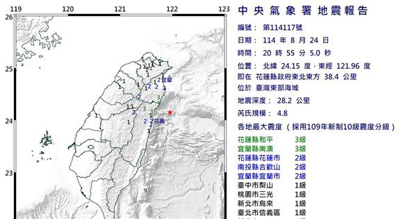 Share Facebook Twitter LinkedIn Pinterest Email 2025/8/24 21:00(8/24 21:09 更新) 台灣東部海域24日晚間8時55分發生芮氏規模4.8地震。(圖取自氣象署網頁cwa.gov.tw) (中央社台北24日電)根據中央氣象署最新資訊,24日20時55分發生芮氏規模4.8地震,地震深度28.2公里,震央位於花蓮縣政府東北東方38.4公里(位於台灣東部海域),最大震度花蓮縣、宜蘭縣3級。(編輯:蕭博文)1140824 中央社「一手新聞」 app 本網站之文字、圖片及影音,非經授權,不得轉載、公開播送或公開傳輸及利用。