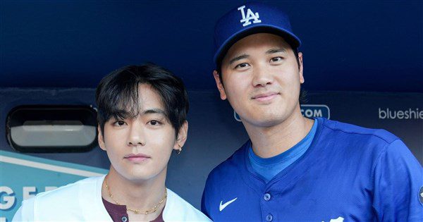 今天賽前,V身穿7號球衣(象徵防彈7名成員)坐在休息區時,道奇隊日籍球星大谷翔平走了過來,雙方握手、相擁,還一起合影留念。道奇隊官方X發布珍貴的歷史會面動畫,寫上IDOL(偶像),既代表2人都是世界級偶像,也呼應防彈少年團的歌曲名稱。