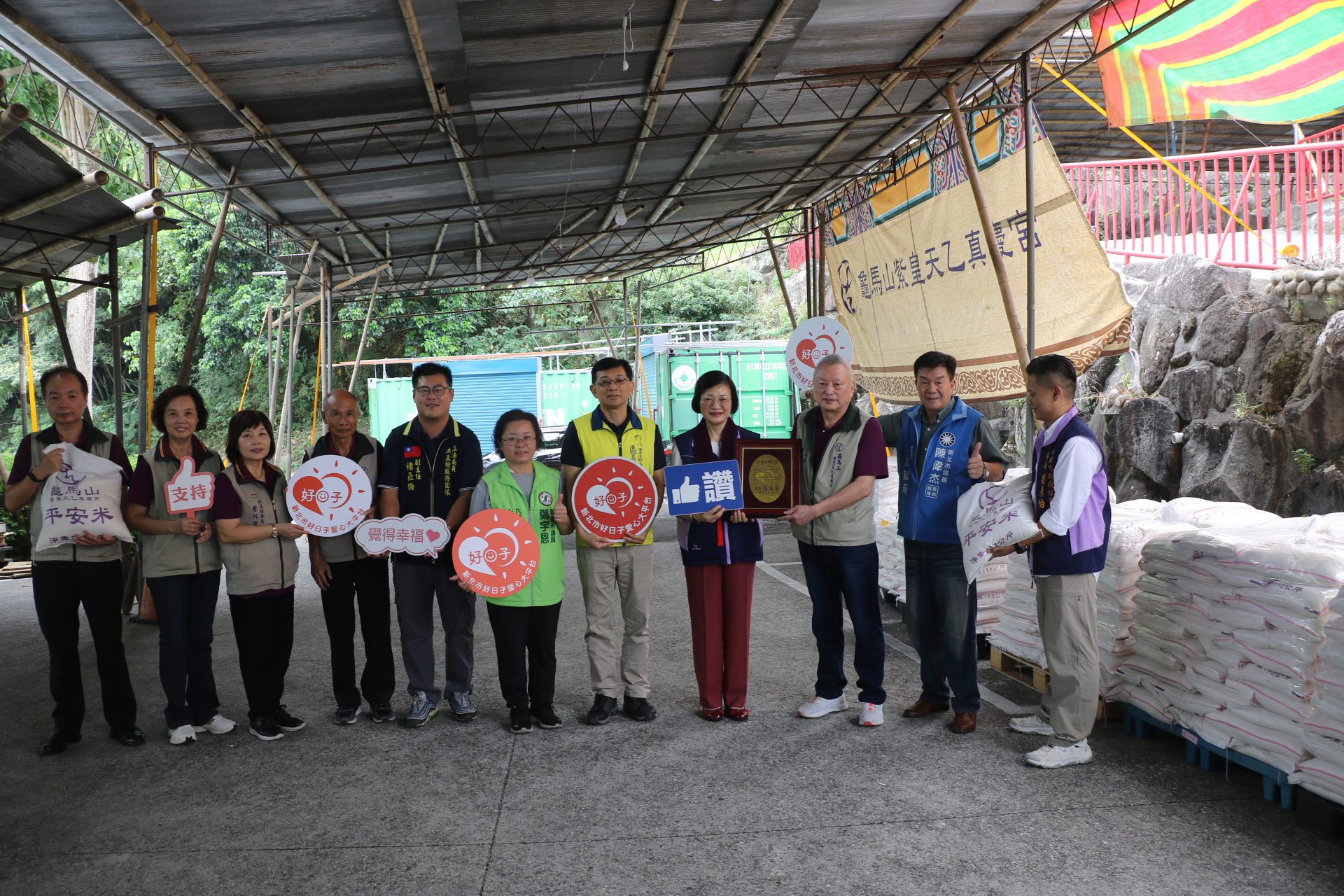 以供奉玄天上帝的新北市八里區龜馬山紫皇天乙真慶宮,每年農曆七月,均會舉行普渡法會,法會結束後,將信眾的善心化為實質行動,與新北市弱勢家庭分享。昨(1)日再度捐贈白米8,000斤,由社會局長李美珍代表侯友宜市長到場受贈。