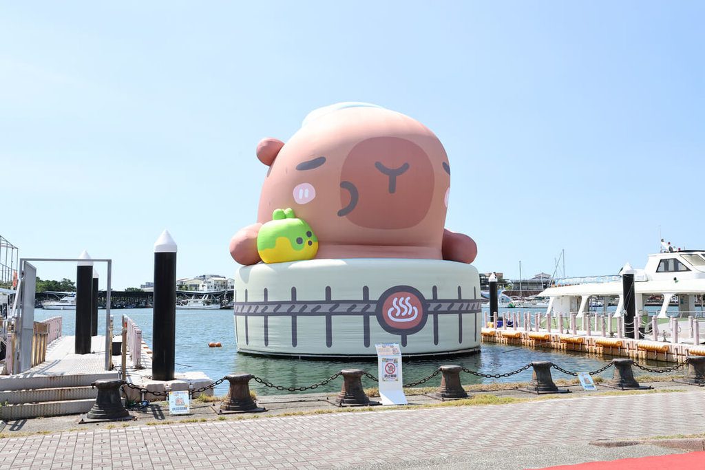 市府表示,此次活動全新設計,12公尺高「卡比胖拉」水上氣偶首次在安平漁人碼頭現身,以經典慵懶泡湯造型、手抱在地特產「青皮椪柑」,再搭配周邊水域環境,營造療癒人心的可愛氛圍;入夜後更隨著音樂及燈光變化,展現和白天截然不同的視覺魅力。