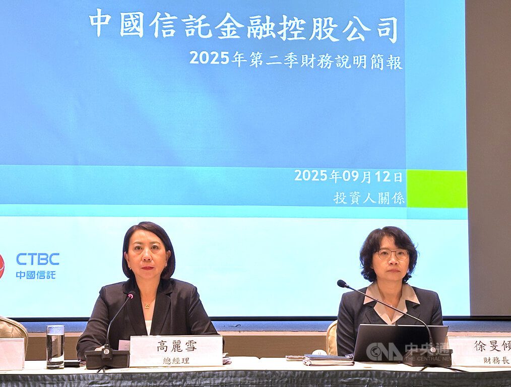 中信金12日舉行第2季法人說明會,由中信金總經理高麗雪(左)、財務長徐旻傾(右)共同主持。高麗雪表示,中信銀上半年海外據點占銀行整體獲利36%,業務動能良好,未來持續跟隨台商腳步,深化美國、越南、印度、日本、澳洲與印尼等國布局。中央社記者蘇思云攝 114年9月12日