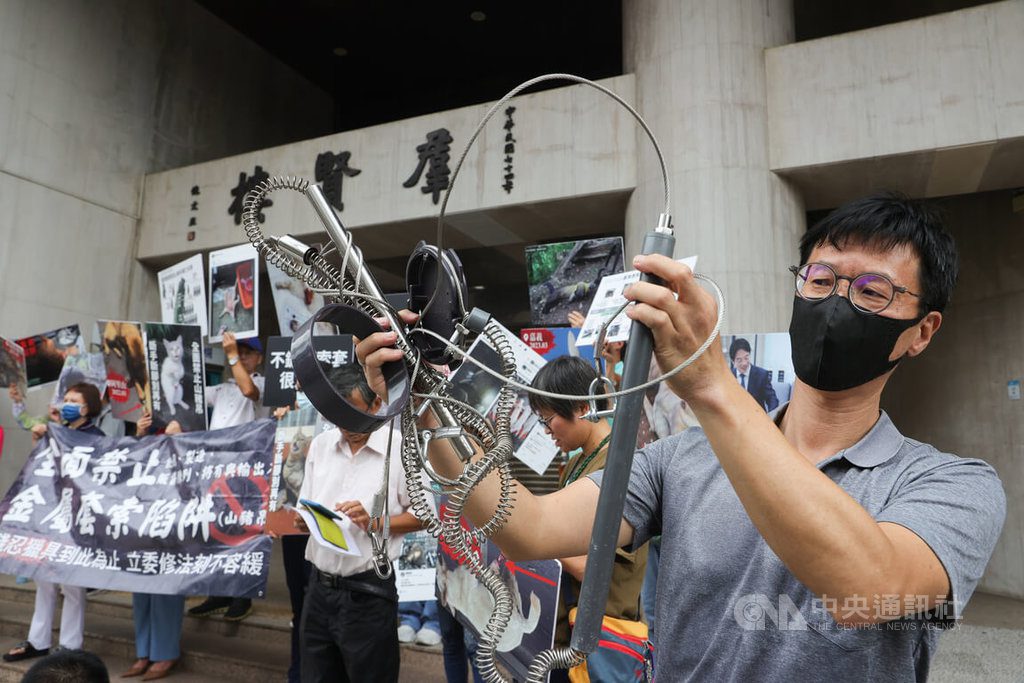 今天出席動保團體主張「全面禁止山豬吊,入法刻不容緩」;動保團體表示,山豬吊造成野生動物、流浪犬貓等無差別、殘忍殺戮,有幸獲救動物終身斷掌、斷肢,改良式山豬吊僅是小型版山豬吊,無差別殺傷力一樣強大,全面禁止山豬吊符合世界潮流。