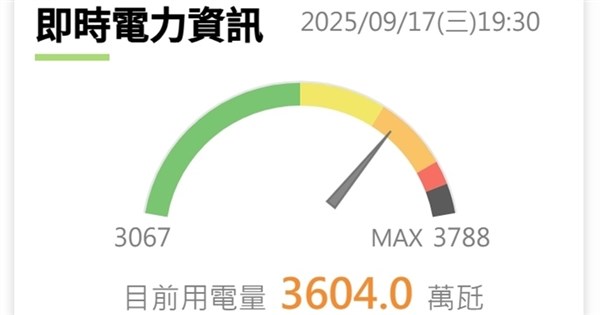 台電原先預估今天尖峰負載預3990萬瓩、最大供電能力4351.5萬瓩,根據台電官網最新資訊,白天尖峰負載實際為3987.9萬瓩,最大供電能力增約60萬瓩、達4411.2萬瓩,日尖峰當下供電仍守住「充裕」綠燈。
