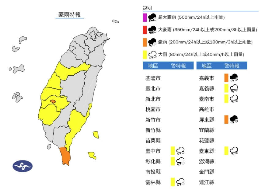 豪雨地區包括嘉義市、恆春半島;大雨地區則有台中市、彰化縣、雲林縣、嘉義縣、台南市、台東縣、蘭嶼、綠島。(編輯:林恕暉)1140918