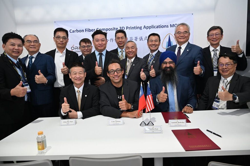 兩年一度的台灣國際航太暨國防工業展今天進入尾聲,漢翔今天發布訊息宣布,於台北航太展中,展出多項自製零件與系統件,19日與美國Orbital Composites簽署「碳纖複材3D列印」新世代技術的合作協議,由漢翔生產處處長李仁揮與Orbital公司執行長巴德斯翰(Amolak Badesha)代表簽署;漢翔總經理曹進平、Orbital公司技術長尼爾森(Cole Nielsen)等共同見證。