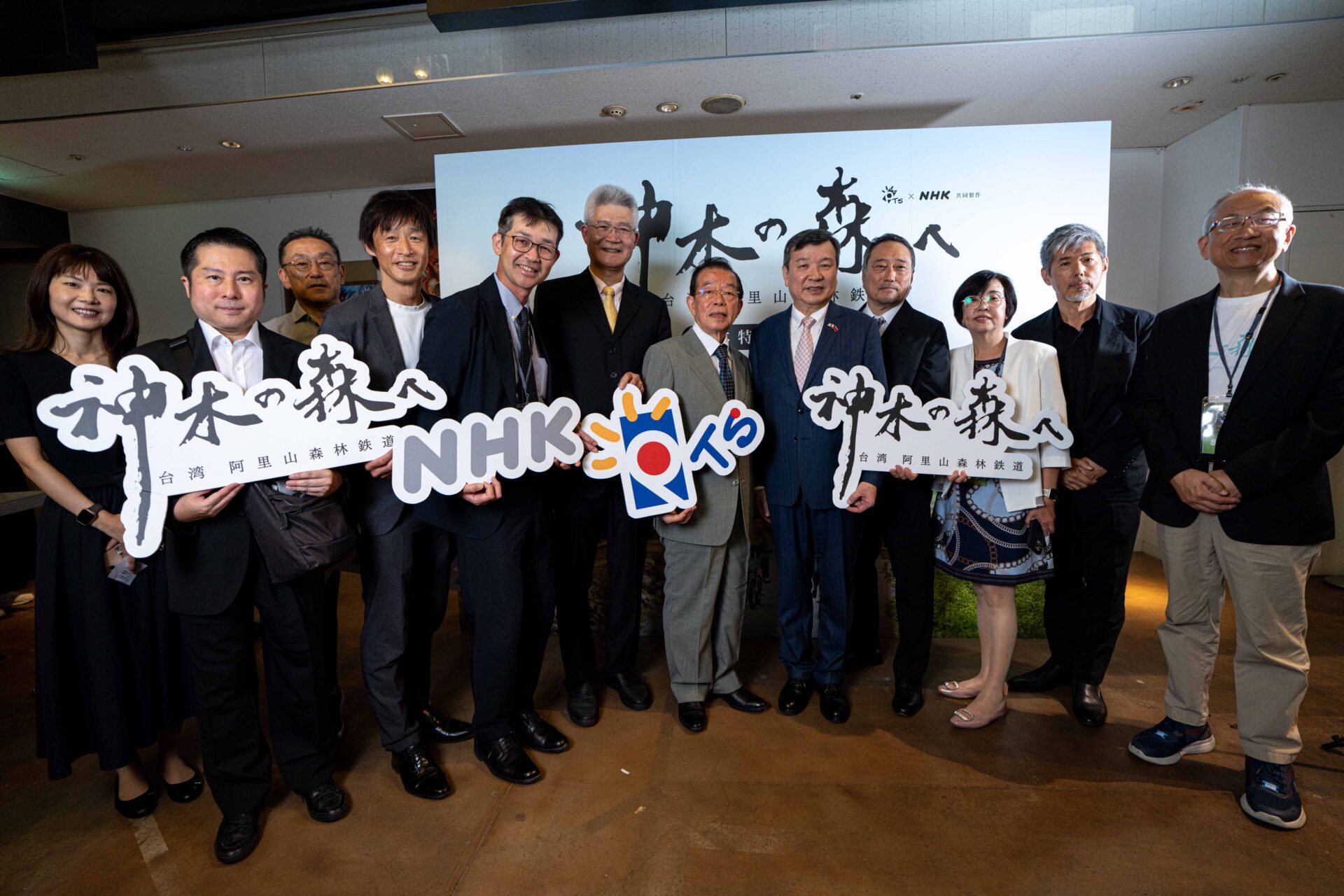 台灣公共電視董事長胡元輝(左六起)台灣維新基金會董事長謝長廷、台北駐日經濟文化代表處代表李逸洋、NHK國際內容策進部長加藤拓與《神木之森》台日製作團隊合影。 照片提供:公共電視