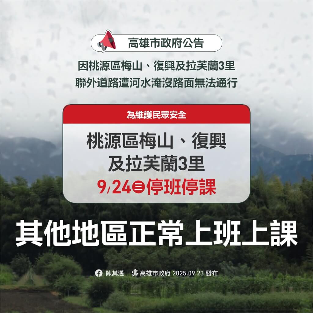 Share Facebook Twitter LinkedIn Pinterest Email 2025/9/23 18:21(9/23 18:30 更新) 高雄市桃源區梅山、復興及拉芙蘭3里24日停班停課。(高雄市政府提供) (中央社記者蔡孟妤高雄23日電)高雄市政府今晚宣布,桃源區梅山、復興及拉芙蘭3里,因聯外道路遭河水淹沒,無法通行,基於安全性考量,明天停止上班、停止上課;其他地區正常上班上課。(編輯:黃名璽)1140923 中央社「一手新聞」 app 本網站之文字、圖片及影音,非經授權,不得轉載、公開播送或公開傳輸及利用。