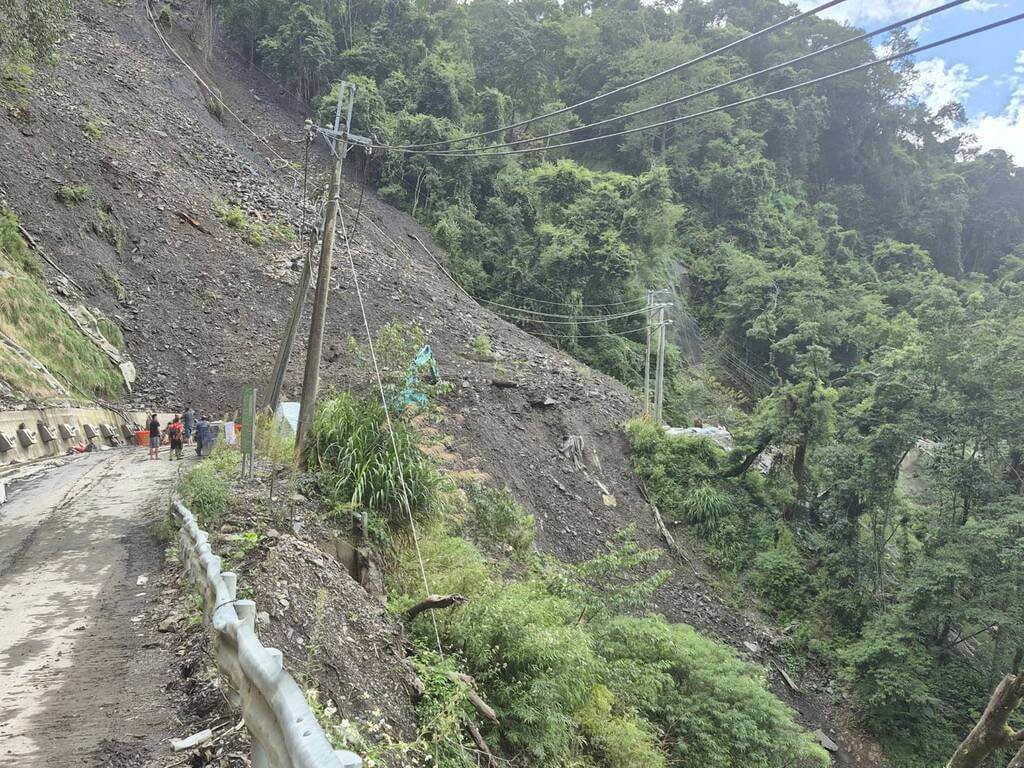 投89線37.6公里處屬於仁愛鄉發祥村路段,居民表示,此處因先前大、小崩塌,機具持續整治邊坡,近期雨勢較大,今天大面積坡面滑動,現場雖有挖土機,但需待天氣及坡面穩定才能進場搶通,以維護人員安全。